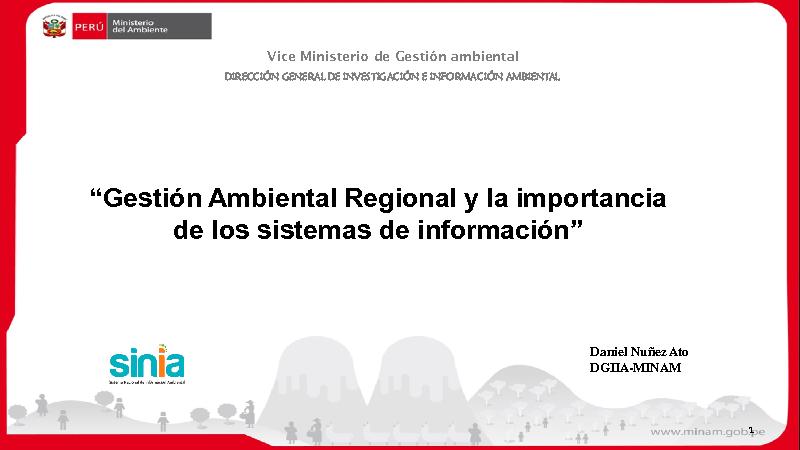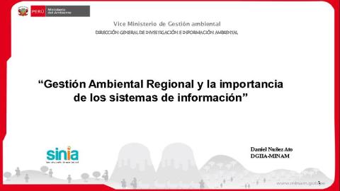 Esta presentación realizada por el Ing. Daniel Nuñez Ato, especialista del Ministerio del Ambiente, se llevó a cabo en el taller para promover el Proyecto de Inversión Pública "Mejoramiento y Ampliación del Servicio de Información Ambiental Regional La Libertad", que se realizó el 02 de Setiembre en el Auditorio del Centro de Capacitación Regional de La Libertad.