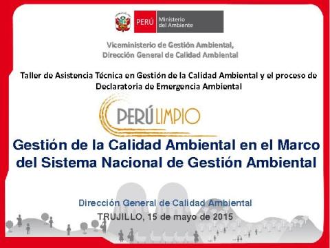 Esta presentación se llevó el 15 de mayo del 2015 en el TALLER “ASISTENCIA TÉCNICA EN GESTIÓN DE LA CALIDAD AMBIENTAL Y EL PROCESO DE LA DECLARATORIA DE EMERGENCIA AMBIENTAL” en el auditorio del Centro Regional de Capacitación del Gobierno Regional La Libertad en la ciudad de Trujillo.