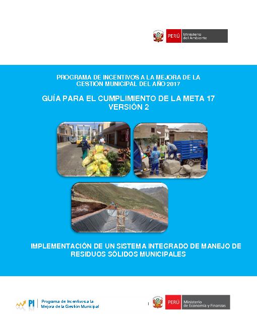 La presente Guía tiene por objetivo establecer las pautas y procedimientos a seguir por las municipalidades para el correcto cumplimiento de la meta 17 “Implementación de un sistema integrado de manejo de residuos sólidos municipales” del Programa de incentivos a la mejora de la gestión municipal.