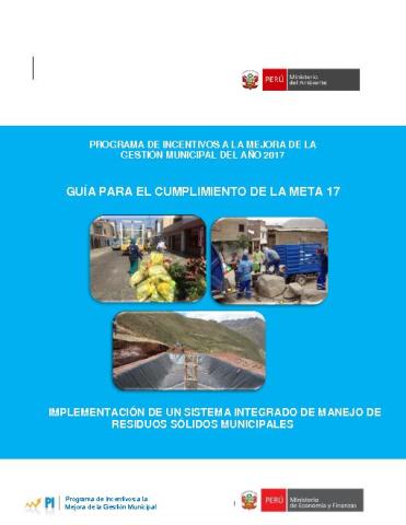 La presente Guía tiene por objetivo establecer las pautas y procedimientos a seguir por las municipalidades para el correcto cumplimiento de la meta 17 “Implementación de un sistema integrado de manejo de residuos sólidos municipales” del Programa de incentivos a la mejora de la gestión municipal para municipalidade tipo A.