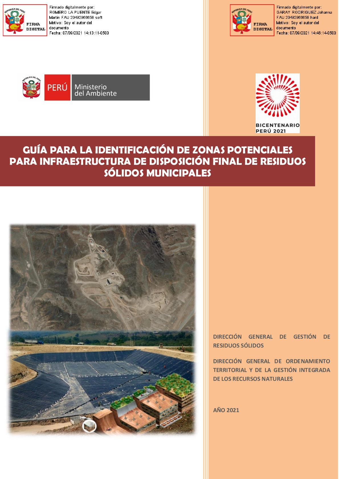 La presente guía tiene por objetivo orientar a los gobiernos locales en la identificación de zonas potenciales para implementar infraestructuras de disposición final de residuos sólidos municipales, como insumo técnico estratégico de los proyectos de inversión de infraestructuras, acordes a las potencialidades y limitaciones del territorio.