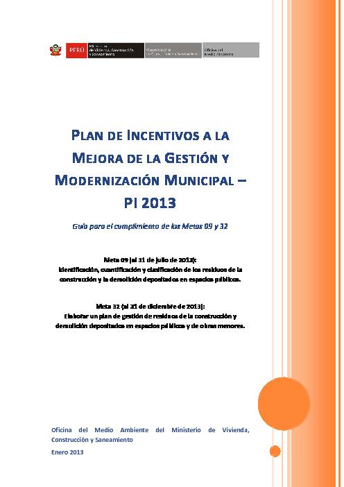 El presente Instructivo tiene como objetivo establecer los lineamientos para el cumplimiento y verificación de las metas 09 y 32, en el marco del Plan de Incentivos a la Mejora de la Gestión y Modernización Municipal del año 2013. Con el fin de contribuir a la mejora de la gestión de los residuos sólidos la construcción y demolición y el propósito de establecer una adecuada gestión de los Residuos de Construcción y Demolición de obras menores a nivel municipal, se establece en el marco del PI (Plan Incentivos) para el año 2013 las siguientes metas: