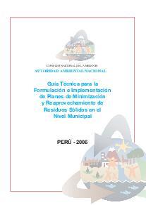 La presente Guía Técnica para la Formulación e Implementación de Planes de Minimización y Reaprovechamiento de Residuos Sólidos en el nivel Municipal, ha sido elaborada con el objetivo de poner a disposición de los funcionarios municipales y público en general, una metodología que permita facilitar el desarrollo de programas de minimización y reaprovechamiento de residuos al nivel municipal.