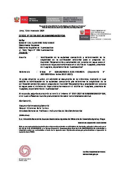 Identificación de la autoridad competente y determinación de la exigibilidad de la certificación ambiental para el proyecto de inversión “Mejoramiento y ampliación del servicio de agua para el sistema de riego piedra hermosa en el distrito de Huaytara,