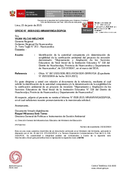 Identificación de la autoridad competente y/o determinación de exigibilidad de la certificación ambiental del proyecto de inversión denominado: “Mejoramiento y Ampliación de los Servicios Educativos de Nivel Inicial de la Institución Educativa N° 118 del Distrito de Huachocolpa, Provincia de Huancavelica y Departamento de Huancavelica”, de CUI 2459347, en el marco del SEIA.