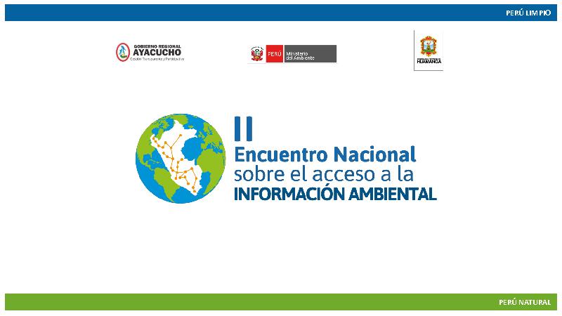 Este evento se realizó con la finalidad de intercambiar experiencias, presentar los avances y resultados alcanzados por las entidades del Estado a nivel nacional, para garantizar el acceso a la información sobre el ambiente y los recursos naturales, se realizó en la ciudad de Ayacucho, organizado por Gobierno Regional de Ayacucho a través de la Gerencia Regional de Recursos Naturales y Gestión del Medio Ambiente y el Ministerio del Ambiente.