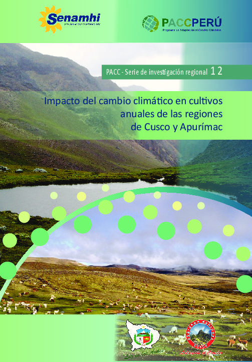 Los impactos del cambio climático hacia el 2030 sobre cultivos de seguridad alimentaria (papa, trigo, cebada,habas y maíz) de los departamentos de Cusco y Apurímac fueron evaluados utilizando un modelo biofísico(modelo FAO modificado por Lhomme 2009) y datos climáticos de escenario futuro provenientes de lamedia de modelos climáticos el WRF 3.2 (Instituto de Meteorología Max Planck de Alemania) y TL959L60/MRI (Instituto de Investigación Meteorológica y Agencia Meteorológica del Japón), ambos de resolución de20ºx20º, y datos de características de los cultivos. Los impactos en los cultivos bajo el escenario del 2030donde los cambios en el clima parecen no ser tan significativos (temperatura aumentaría hasta 1,3ºC; y lluviascon variabilidad de + 15%, excepto Sicuani -28%) indican que los rendimientos y el porcentaje de siembrasperdidas no cambiarían, excepto donde ocurrirían disminuciones considerables de lluvias, los déficits derendimientos alcanzarían hasta en un 12 a 15%, y el porcentaje de siembras perdidas hasta en un 4 a 7%respecto a los valores actuales; además ligeramente el ciclo de los cultivos se acortaría hasta en 13 días y lascosechas se adelantarían en ese mismo tiempo de días.