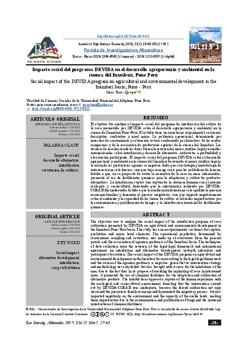 El objetivo fue analizar el impacto social del programa de interdicción del cultivo de la coca promovido por DEVIDA sobre el desarrollo agropecuario y ambiental en la cuenca del Inambari Puno-Perú. El estudio tiene un carácter no experimental, seccional, descriptivo, cualitativo y nivel micro Las técnicas de recolección de los datos fueron la revisión del marco jurídico-legal y acuerdos internacionales sobre interdicción y desarrollo alternativo, entrevistas a profundidad y observación participante.