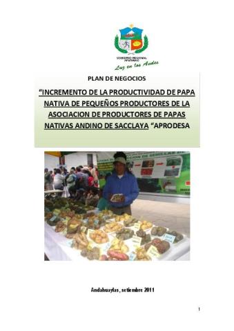 El presente Plan de Negocios, Producción, Comercialización y Capacitación en Gestión Empresariales de Papa Nativa, ha sido elaborado con el objetivo fundamental de desarrollar el diagnostico de la situación actual, en la que se encuentra la Asociación de Productores de Papas Nativas Andino de Sacclaya” “APRODESA identificando sus debilidades, fortalezas con las que cuenta para desarrollar la cadena productiva de papa nativa y las oportunidades, amenazas que debe enfrentar para introducir su producto en el mercado.