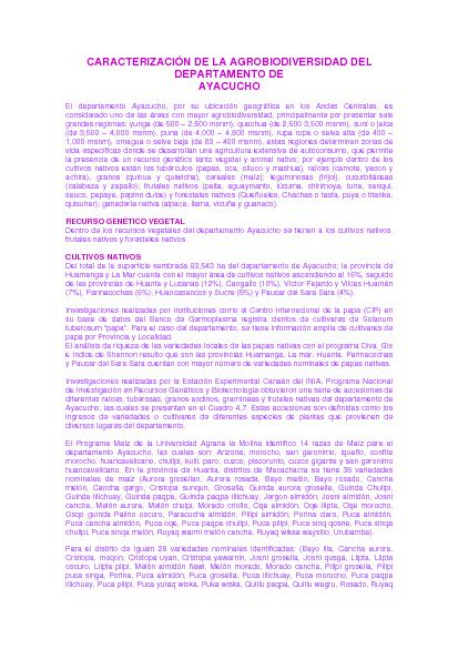 El departamento Ayacucho, por su ubicación geográfica en los Andes Centrales, es considerado uno de las áreas con mayor agrobiodiversidad, principalmente por presentar seis grandes regiones: yunga (de 500 – 2,500 msnm), quechua (de 2,500 3,500 msnm), suní o j