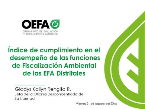 Esta presentación fue realizada por la Ing. Gladys K. Rengifo Reátegui, Jefa de la Oficina Desconcentrada de La Libertad - OEFA, en el Foro Regional \"FISCALIZACIÓN AMBIENTAL PARA EL CAMBIO - REGIÓN LA LIBERTAD\" realizado en el Centro de Convenciones Los Corregidores el pasado 21 de agosto del presente año.