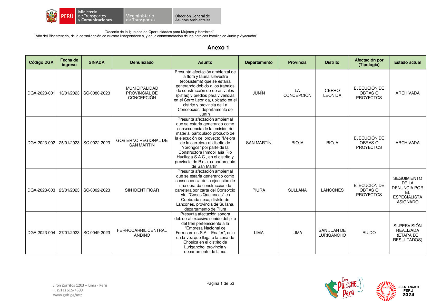 Información anual de las denuncias ambientales recibidas por la Dirección General de Asuntos Ambientales del Ministerio de Transportes y Comunicaciones durante el 2023