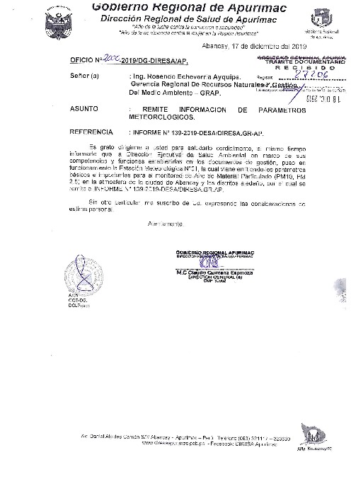 La Direccion Ejecutiva de Salud Ambiental en el marco de sus competencias y funciones establecidas en los documentos de gestion puso en funcionamiento la Estacion Meteorologica Nº 01, la cual viene emitiendo los parametros basicos