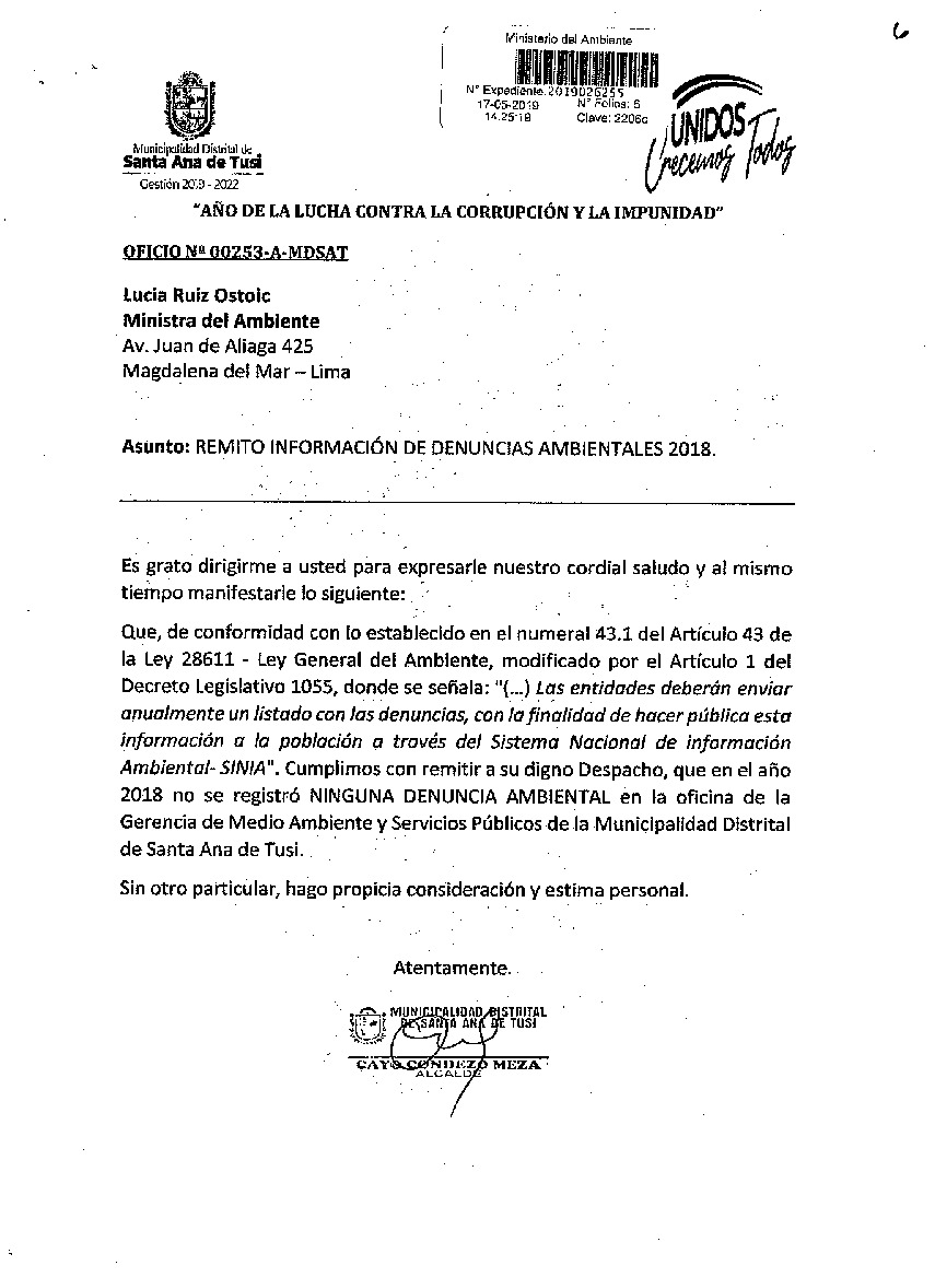 Información de denuncias ambientales 2018 Municipalidad Distrital de Santa Ana de Tusi