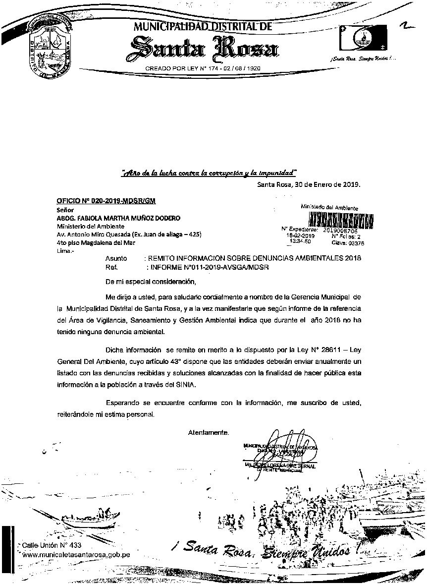 INFORMACION SOBRE DENUNCIAS AMBIENTALES 2018 MUNICIPALIDAD DISTRITAL DE SANTA ROSA