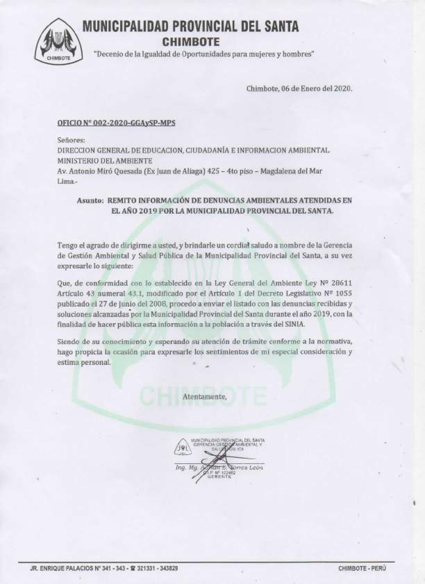 Información de denuncias ambientales 2019 atendidas por la Municipalidad Provincial del Santa