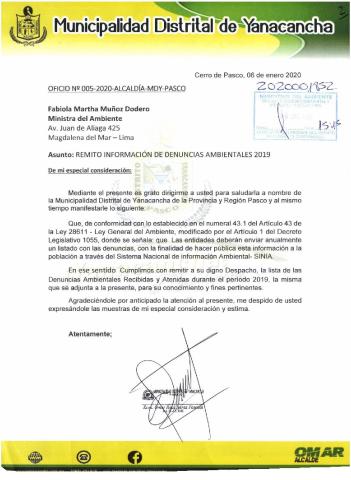 Información de denuncias ambientales 2019 Municipalidad Distrital de Yanacancha