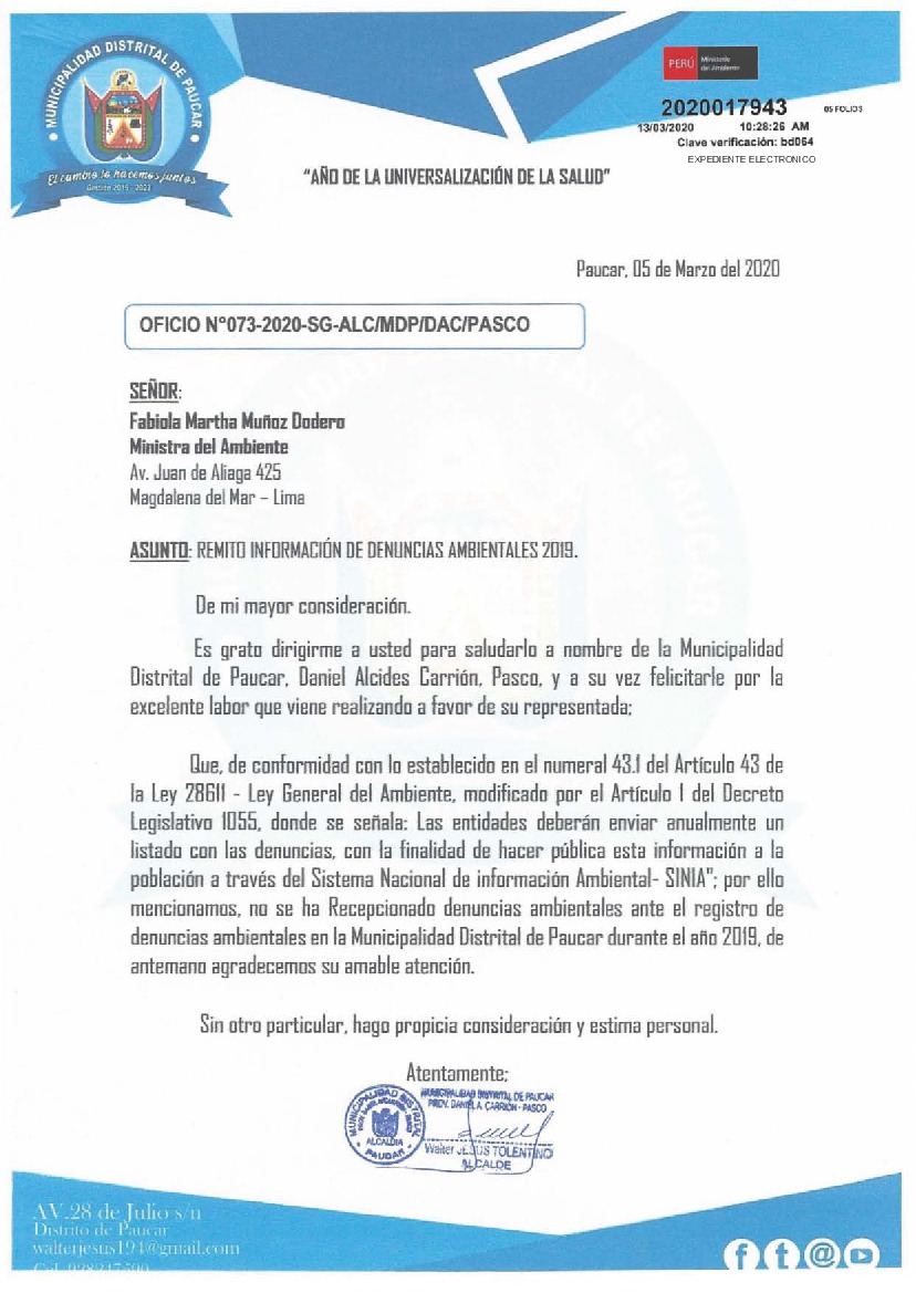 Información de denuncias ambientales 2019 Municipalidad Distrital de Paucar