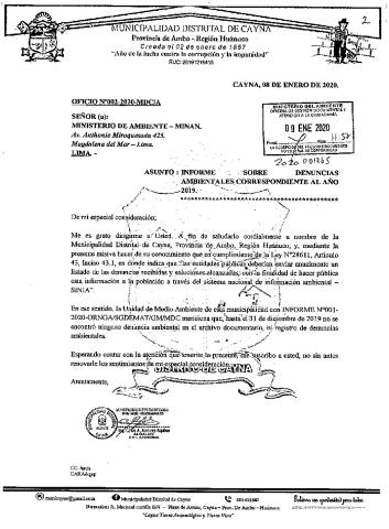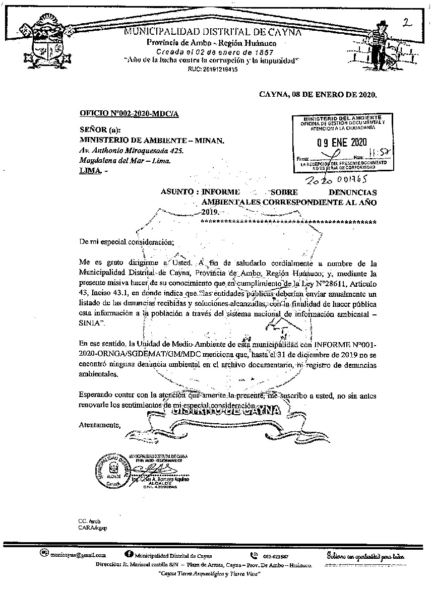 Información de denuncias ambientales del 2019. Municipalidad Distrital de Cayna