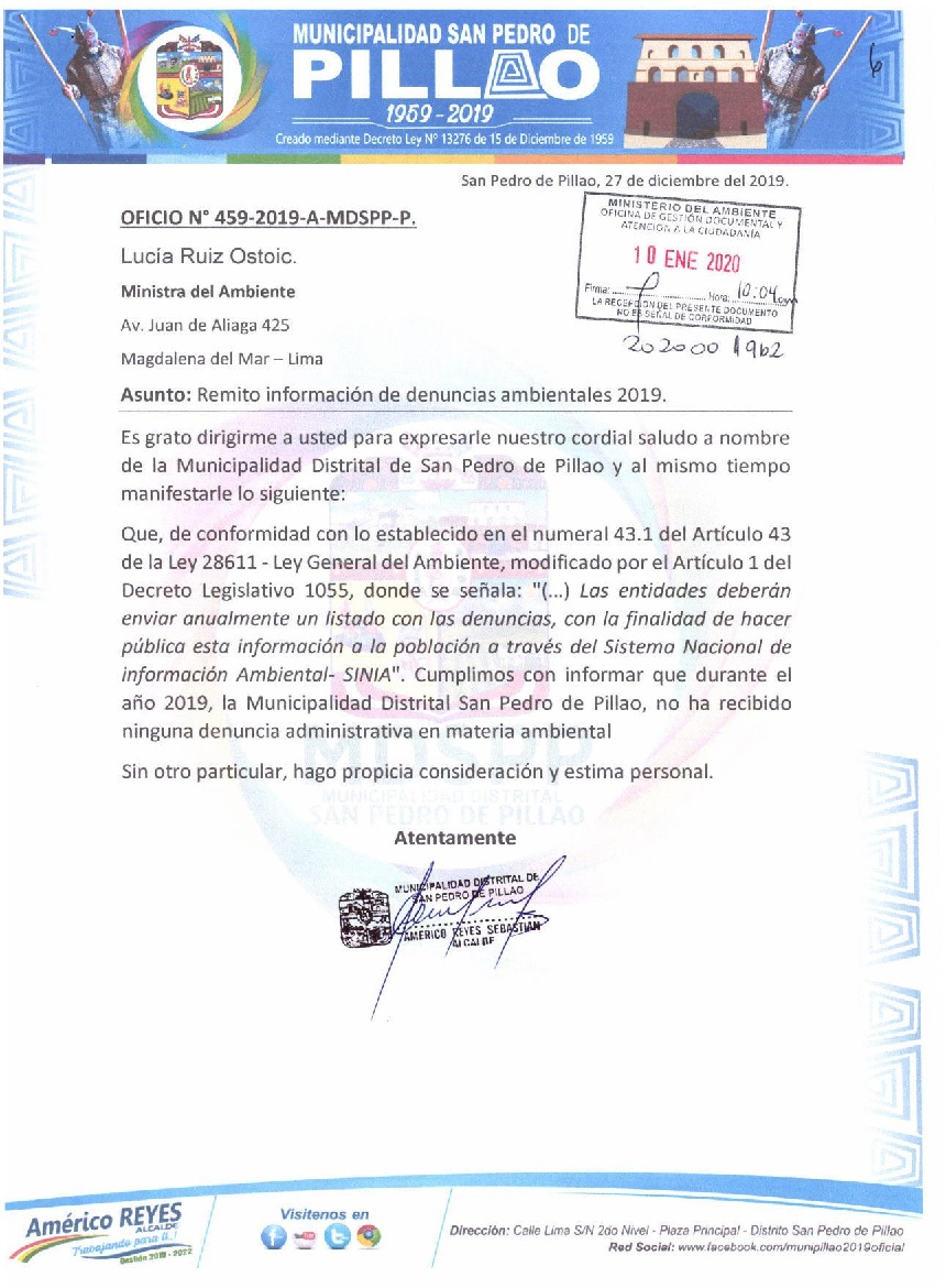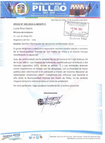 Información de denuncias ambientales del 2019. Municipalidad Distrital de San Pedro de Pillao