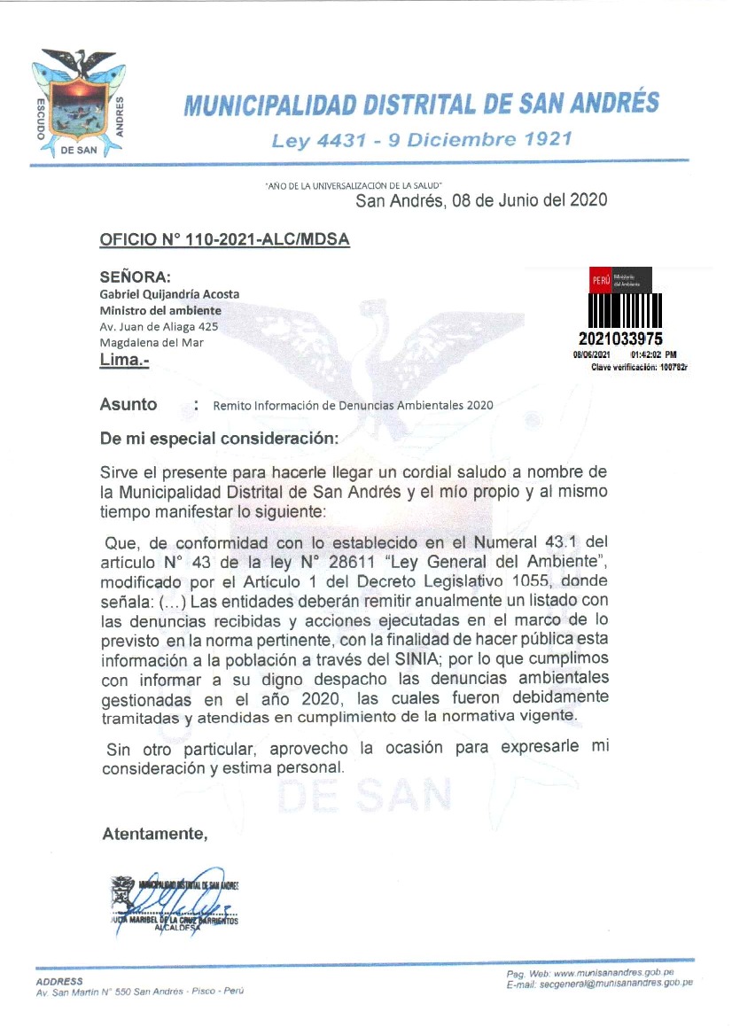 Información de denuncias ambientales 2020 de la Municipalidad Distrital de San Andres