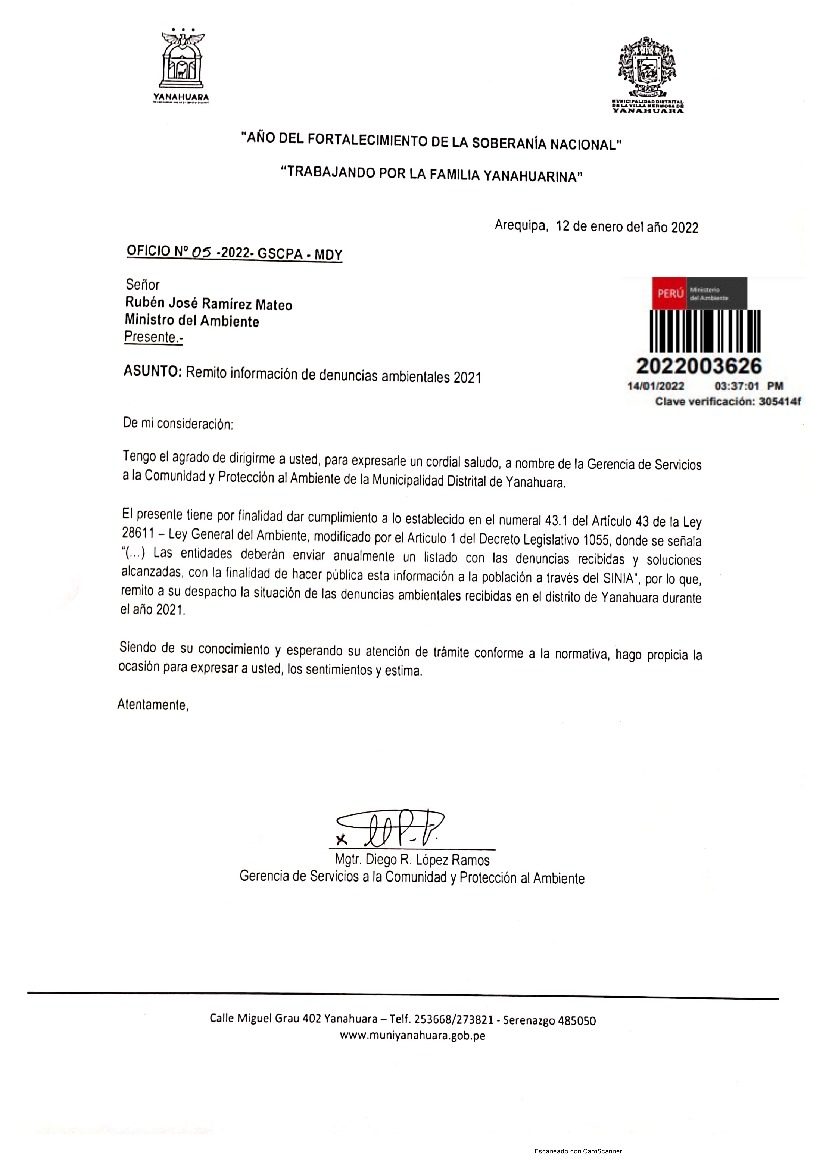 Información de denuncias ambientales 2021 de la Municipalidad Distrital de Yanahuara