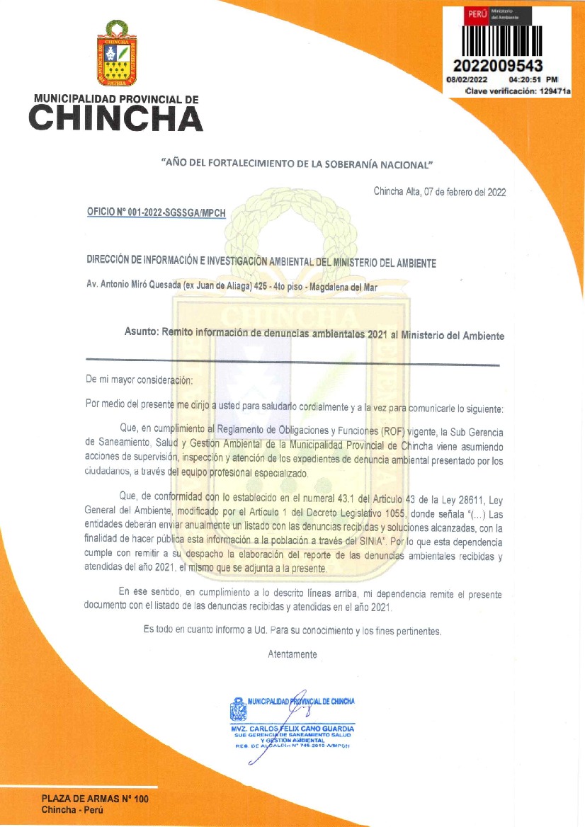 Información de denuncias ambientales 2021 de la Municipalidad Provincial de Chincha