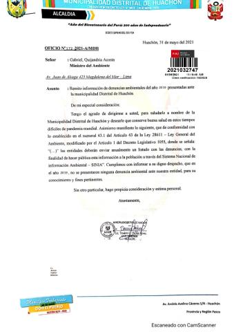 Información de denuncias ambientales del año 2019 presentadas ante la municipalidad Distrital de Huachón