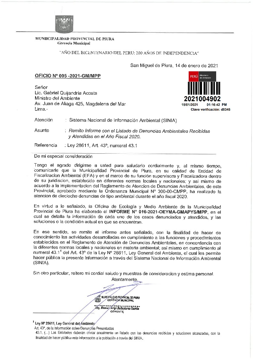 Información de denuncias ambientales del año 2020 de la Municipalidad Provincial de Piura