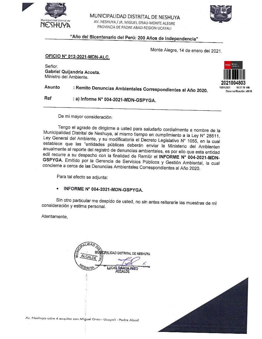 Información de denuncias ambientales del año 2020 de la Municipalidad Distrital de Neshuya