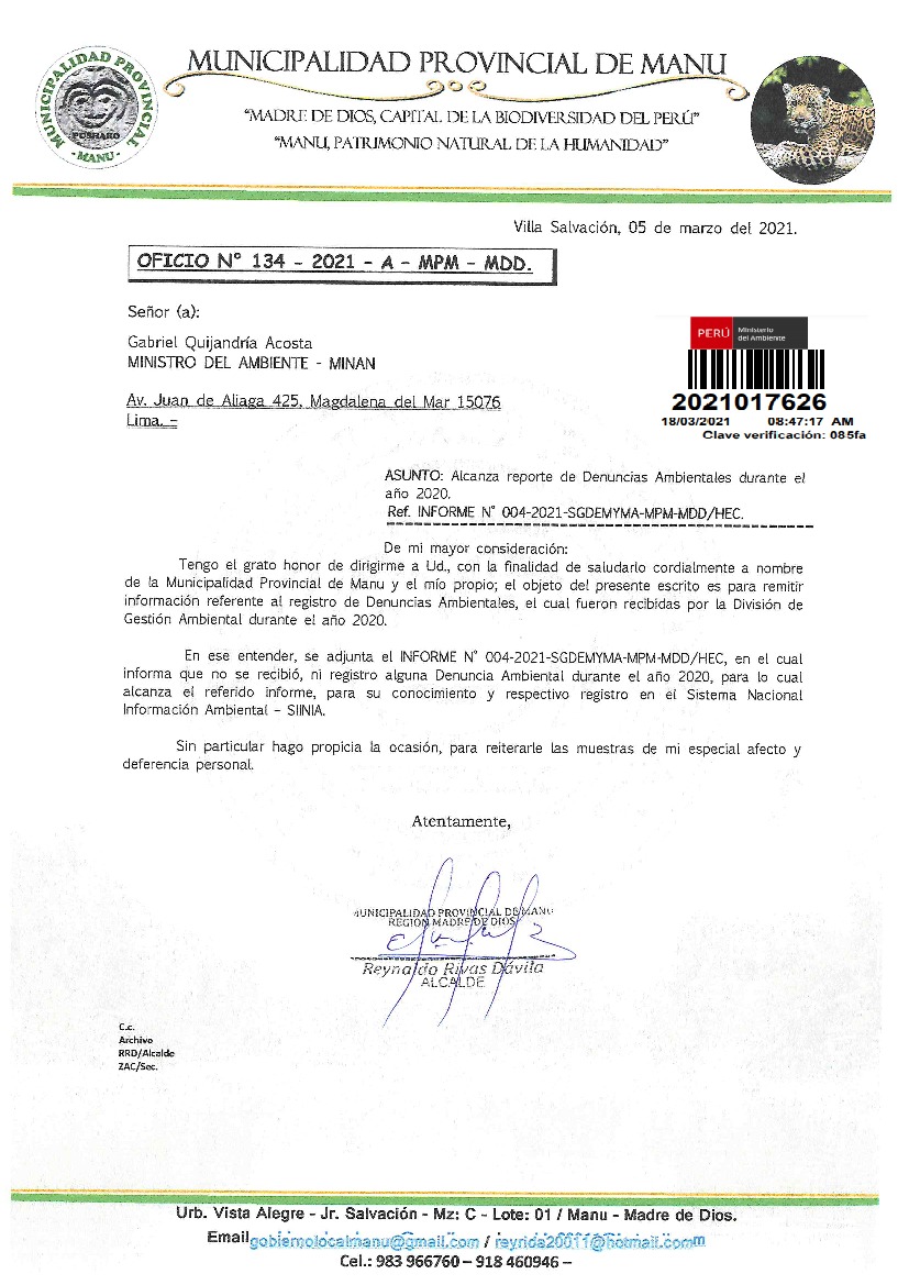 Información de denuncias ambientales del año 2020 presentadas ante la Municipalidad Provincial del Manu