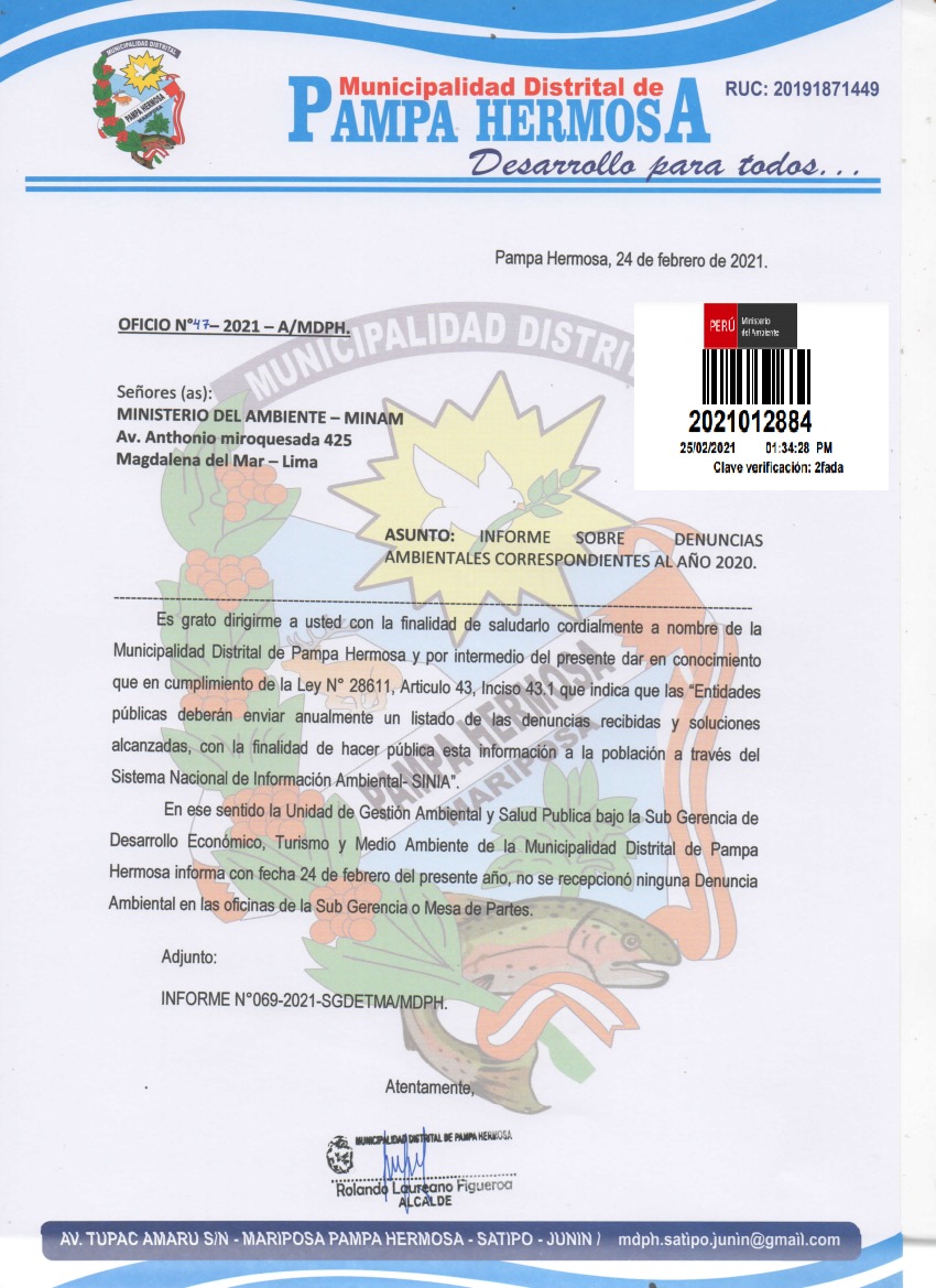 Información de denuncias ambientales del año 2020 presentadas ante la Municipalidad Distrital de Pampa Hermosa