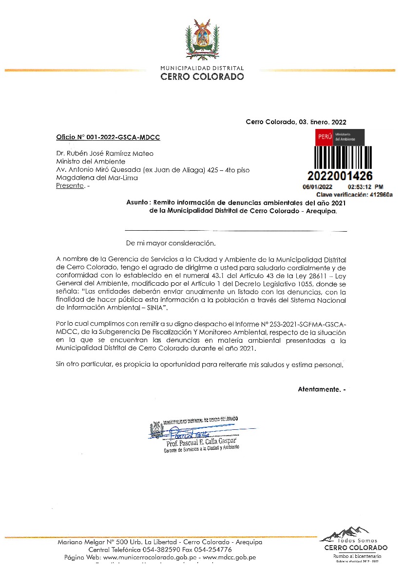 Información de denuncias ambientales del año 2021 de la Municipalidad Distrital de Cerro Colorado