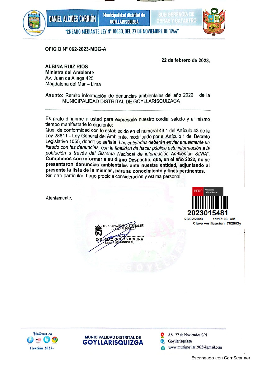 Información de denuncias ambientales del año 2022 de la Municipalidad Distrital de Goyllarisquizaga