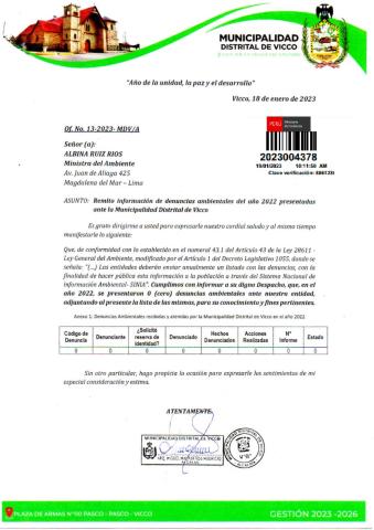 Información de denuncias ambientales del año 2022 presentadas ante la Municipalidad Distrital de Vicco