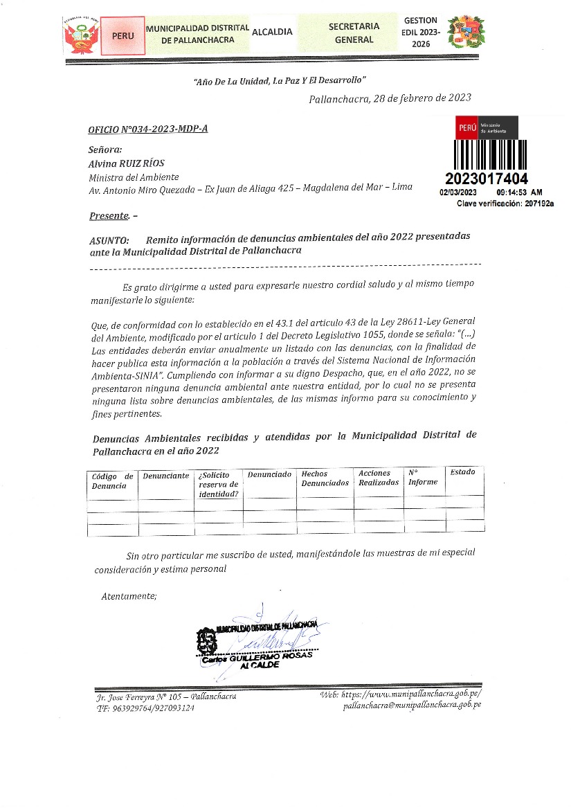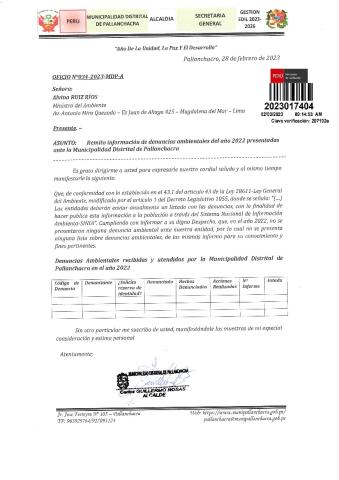 Información de denuncias ambientales del año 2022 presentadas ante la Municipalidad Distrital de Pallanchacra