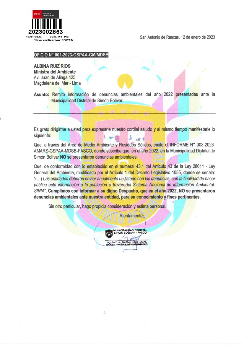 Informacion de denuncias ambientales del año 2022 presentados ante la Municiapalidad Distrital de Simon Bolivar