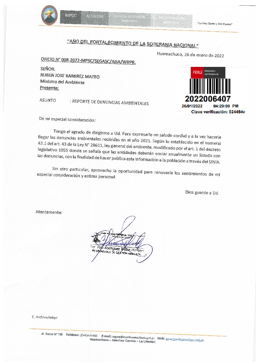 Información de denuncias ambientales correspondiente al 2021 de la Municipalidad provincial de Sanchez Carrión
