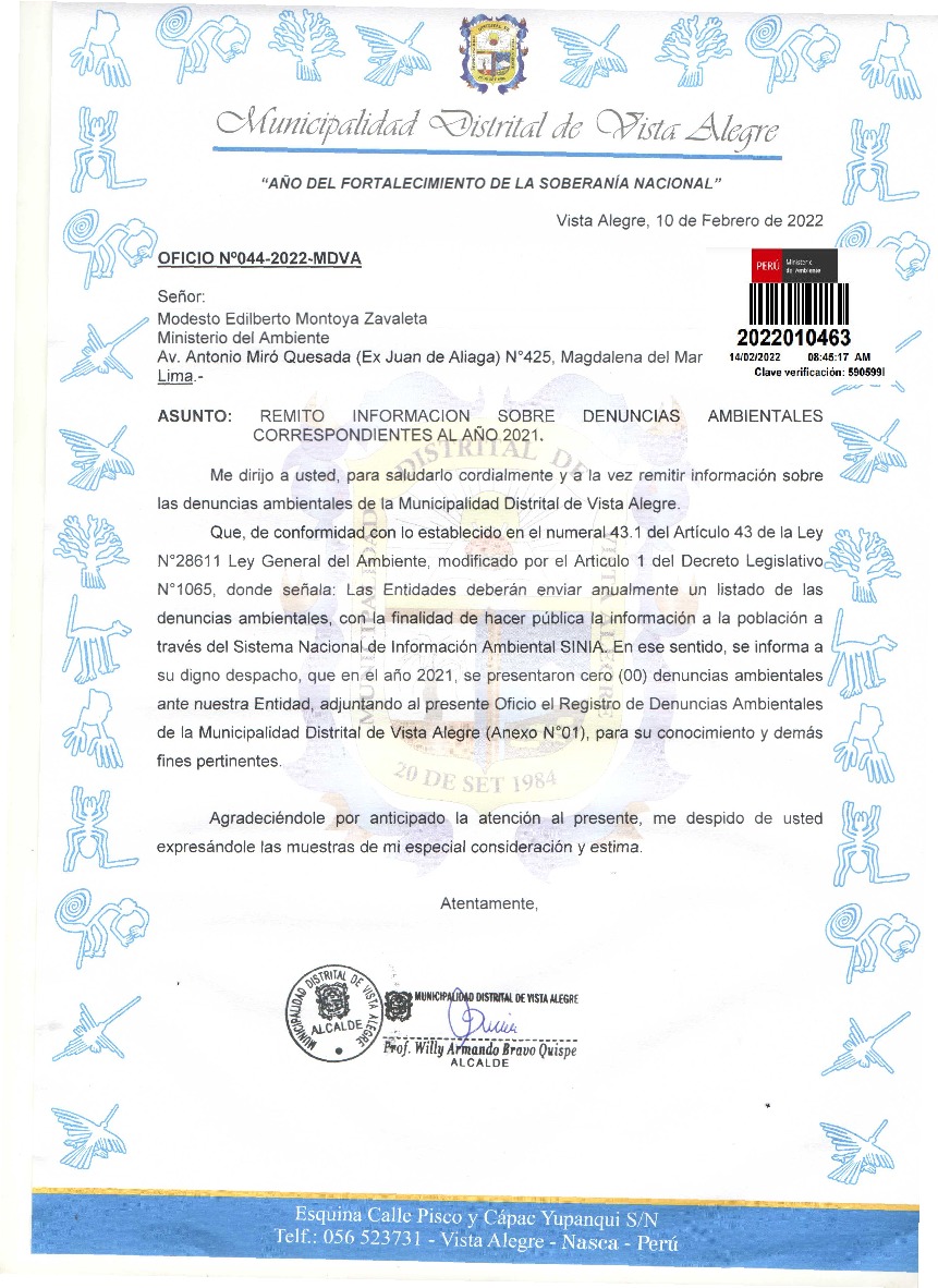 Información de denuncias ambientales correspondiente al año 2021 de la Municipalidad Distrital de Vista Alegre
