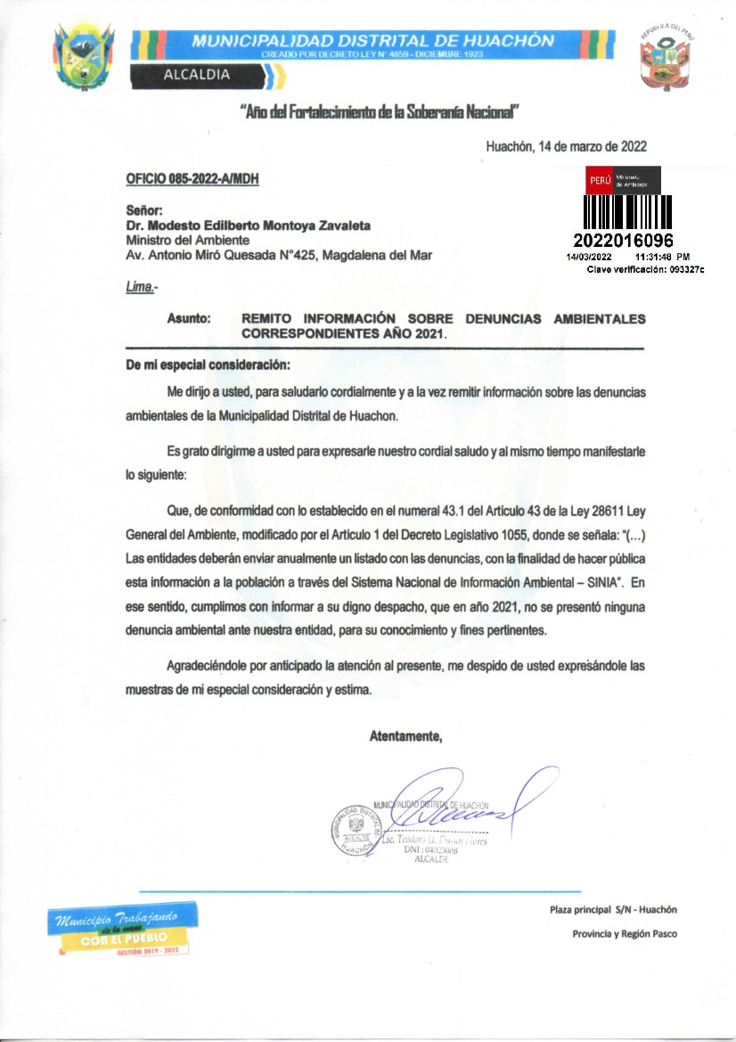 información sobre denuncias ambientales correspondientes año 2021 de la Municipalidad Distrital de Huachón
