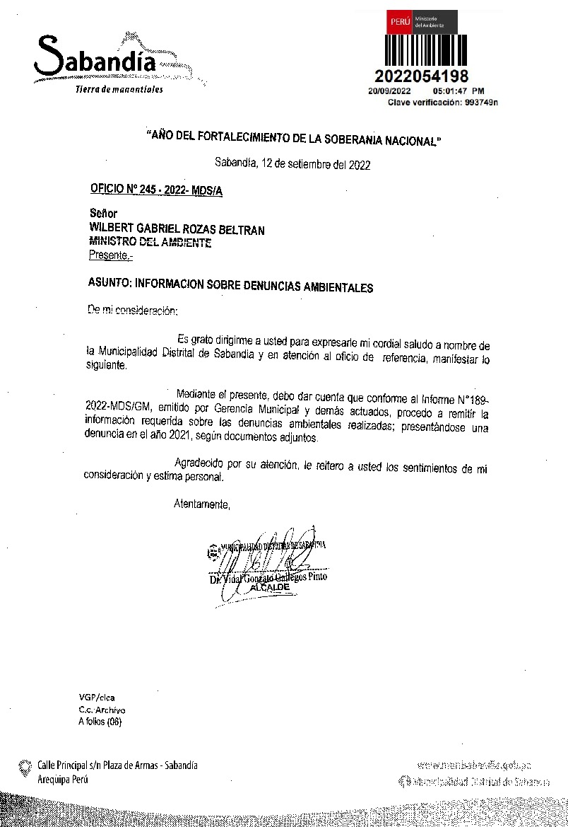 Información sobre denuncias ambientales de la Municipalidad Distrital de Sabandía
