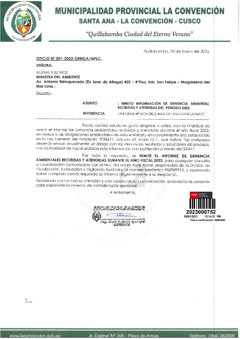 Informacion de denuncias ambientales recibidas y atendidas en el 2022 por la Municipalidad Provincial de La Convencion