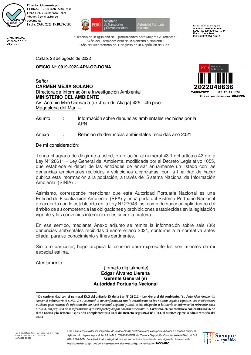 Información sobre denuncias ambientales recibidas por la Autoridad Portuaria Nacional el año 2021