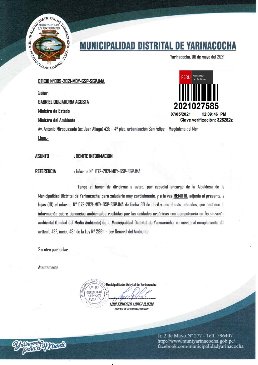Información sobre denuncias ambientales recibidas en la Municipalidad Distrital de Yarinacocha correspondiente al año 2020