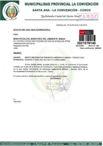 Información de denuncias ambietnales - periodo 2021 de la Municipalidad Provincial de la Convención
