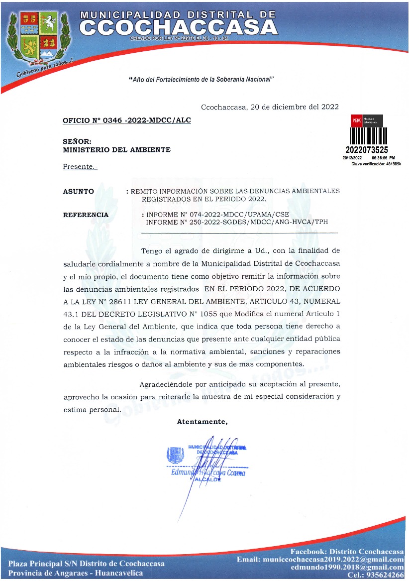 Información sobre las denuncias ambientales registrados en el periodo 2022 de la municipalidad distrital de Ccochaccasa