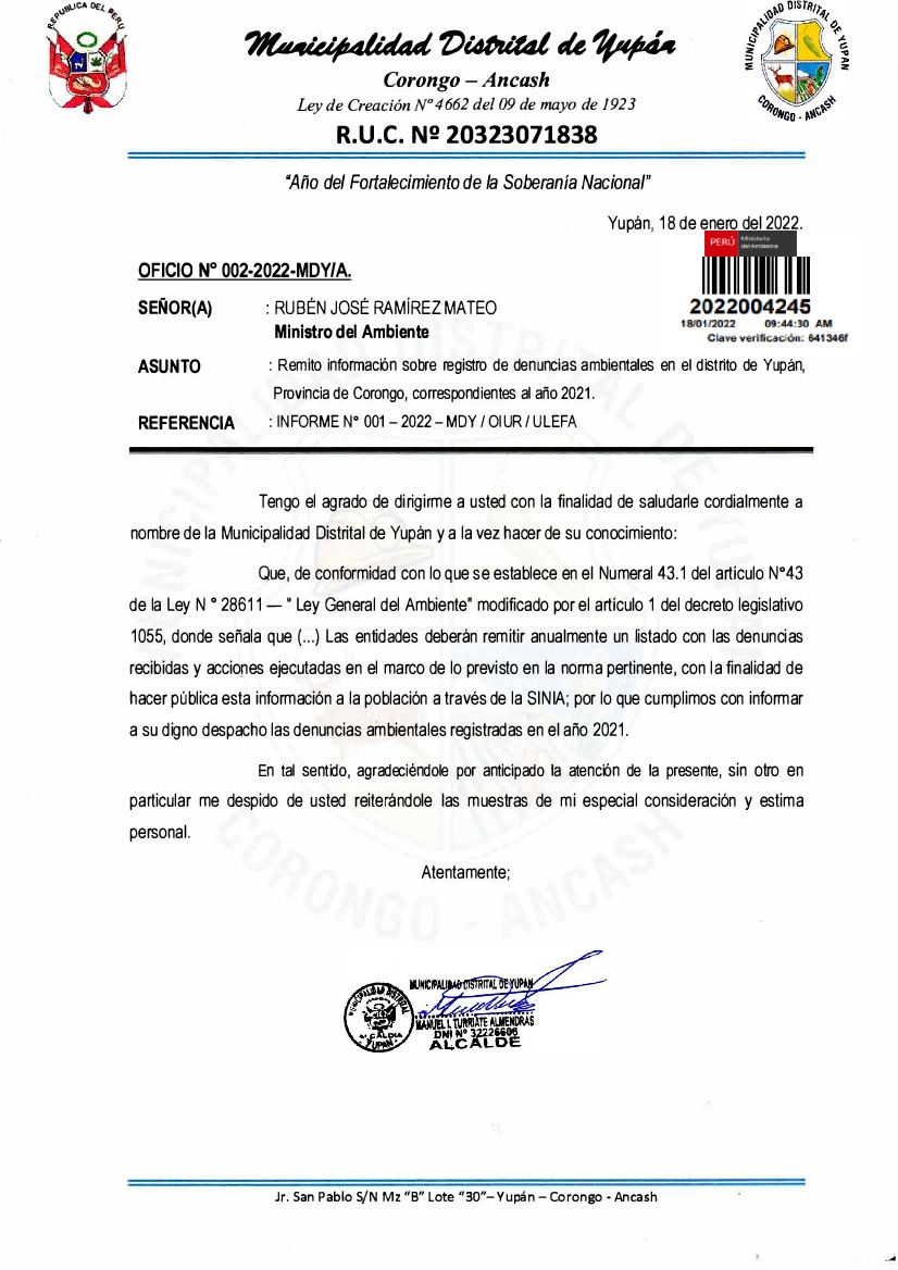 Información sobre registro de denuncias ambientales en el distrito de Yupán, Provincia de Corongo, correspondientes al año 2021.