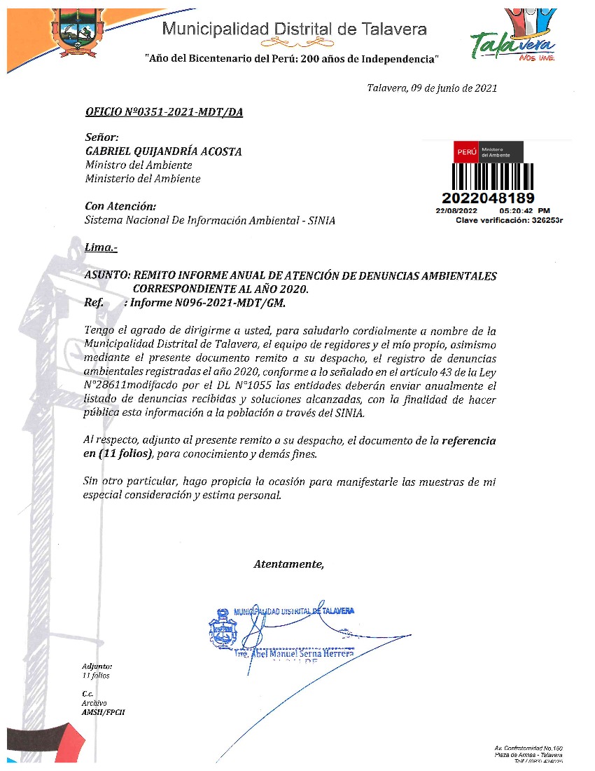 Informe anual de atención de denuncias ambientales 2020 de la Municipalidad Distrital de Talavera