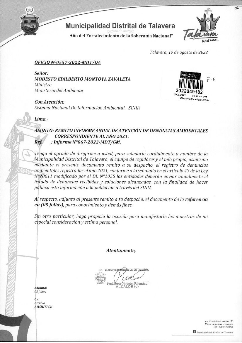 Informe anual de atención de denuncias ambientales 2021 Municipalidad Distrital de Talavera