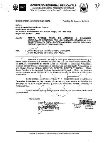 Informe anual de atención a denuncias ambientales recibidas por las unidades orgánicas con competencia en Fiscalización Ambiental (DREM, DlRCETUR, DIREPRO, DlGEFFS Y DIRESA - DESA). Gobierno Regional de Ucayali 2018